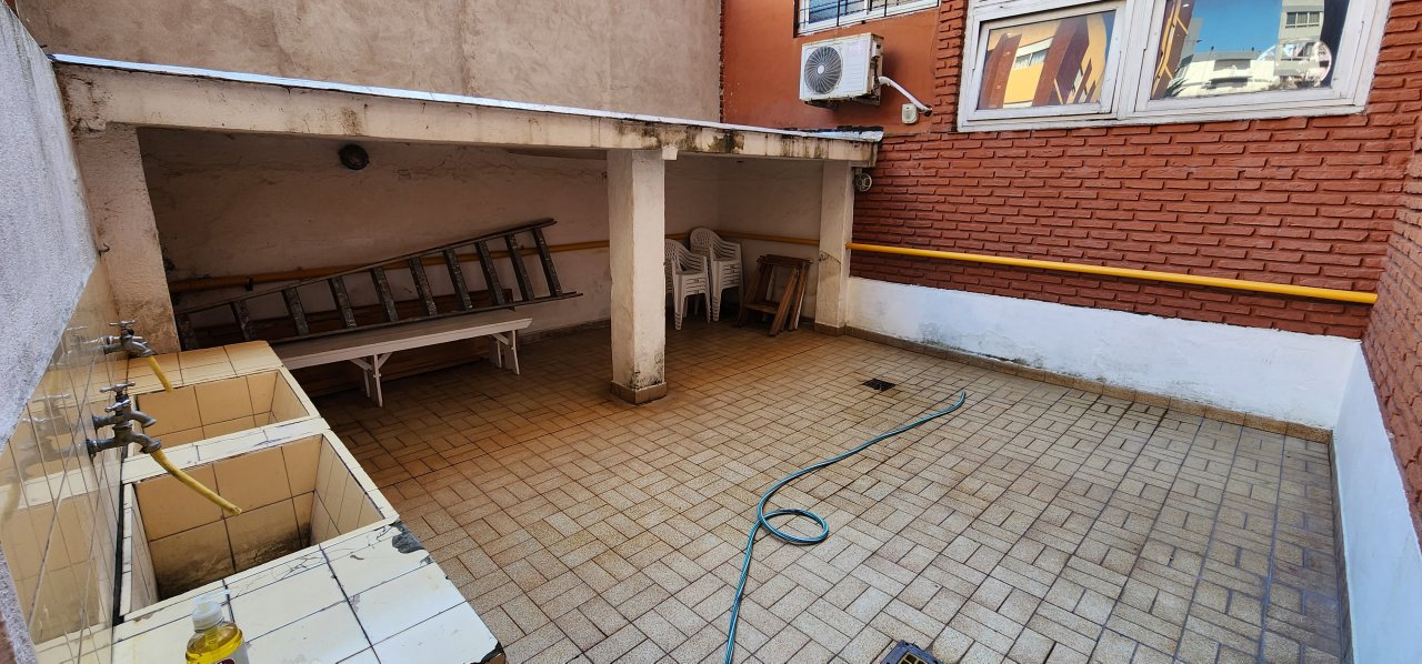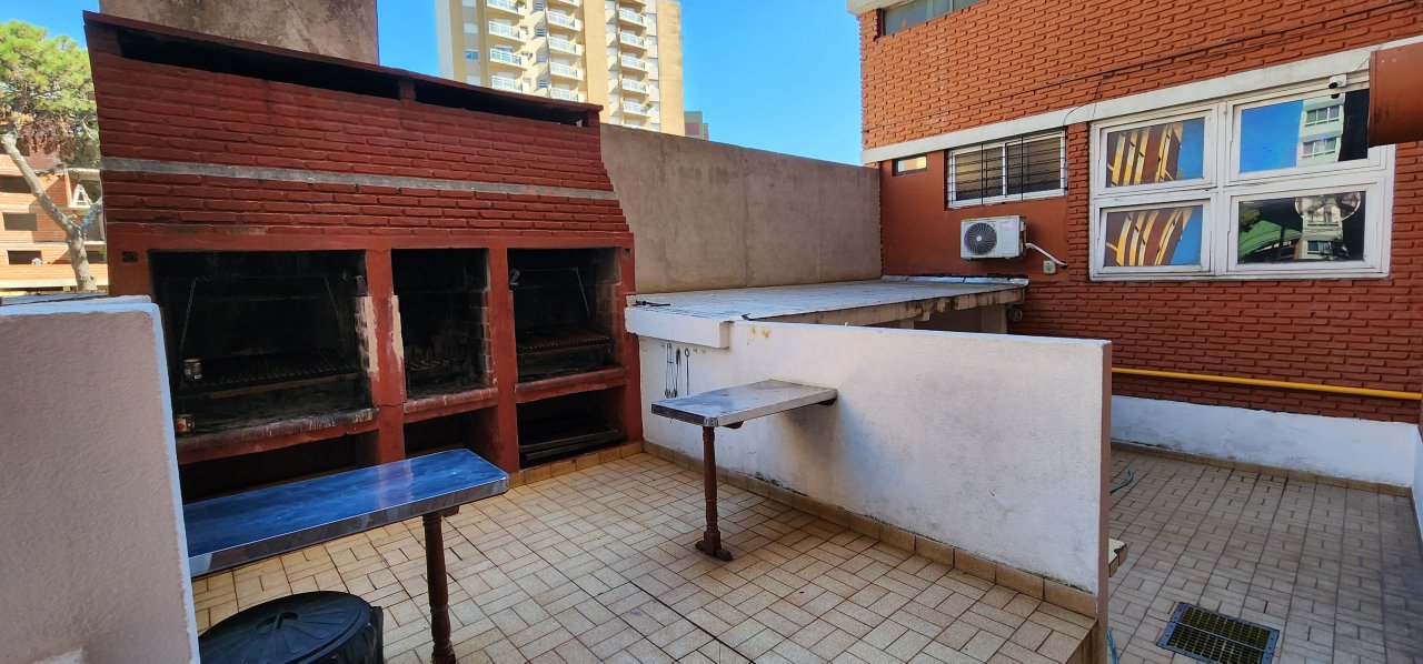 El edificio cuenta con un sector con parrillas, mesas y sillas para compartir.
